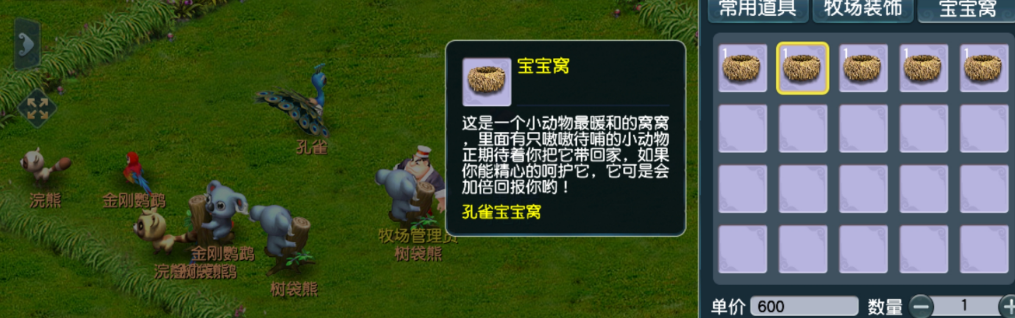 那么,有些玩家可能会问,为什么牧场会出现孔雀和树袋熊。如上图所示,通过每日的牧场积分兑换可以获得这些动物。孔雀需要600积分,树袋熊需要1000积分。因此,每个号都需要预留至少1600积分,以便随时兑换所需的宝宝窝。如果一个号已经兑换了,而另一个没有,可以先留着,等两个号都兑换出来后再进行养殖。