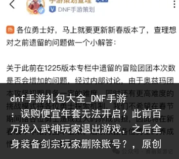 dnf手游礼包大全_DNF手游:误购便宜年套无法开启?此前百万投入武神玩家退出游戏,之后全身装备剑宗玩家删除账号?,原创