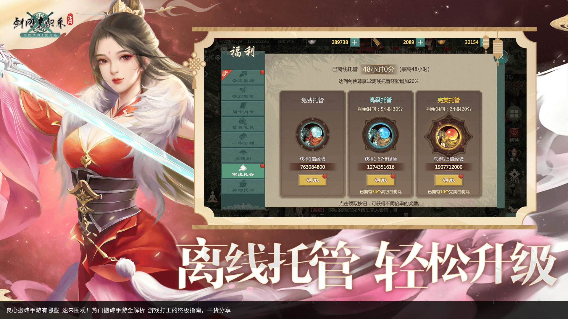 ## 二、武侠世界1. **《剑网1:归来》**:西山居研发的这款武侠手游,继承了端游的经典元素它有独特的货币属性,装备不绑定,搬砖自由度超高没事去野外打打精英怪,或者参加帮会活动,掉落的装备都能拿去摆摊卖钱。