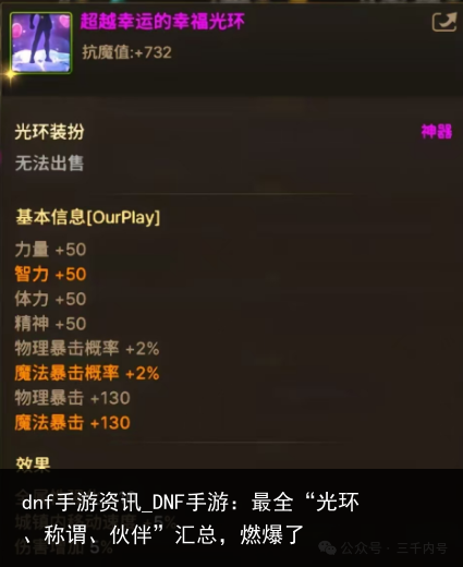 然而,DNF手游的氪金并不是一次性就能完成的,因为随着游戏版本的不断更新迭代,氪金装备的强度也会不断提高隔壁服目前最强的光环叫做“超越幸运的幸福光环”,在“至尊光环”的基础上,增加了2%的暴击率,双攻变为5%的伤害加成,抗魔值从398提升到732。