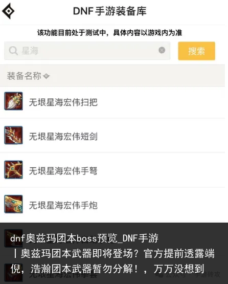 在《DNF手游助手》的装备库中,发现了一组名为无垠星海宏伟XXX的新武器。这一系列武器尚未在游戏中出现,但已在助手装备库中露出端倪,预示着第三代团本武器可能即将上线。
