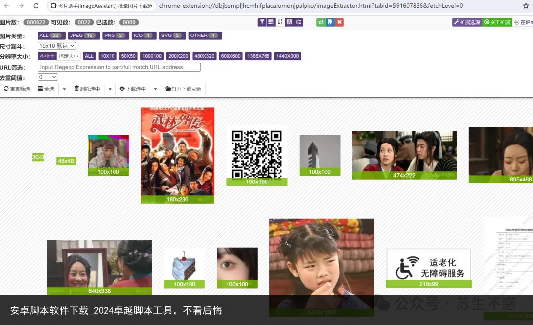 如果只是下载图片,可以使用批量图片下载器图片助手,这款浏览器扩展程序可以嗅探、分析网页图片并提供批量下载等功能。它可以根据图片类型、大小、分辨率和URL进行筛选下载。